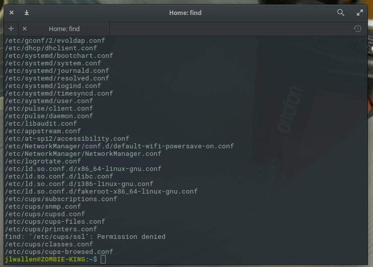 find /etc -type f -name “*.conf”The above command would list all of your .conf files from /etc (Figure 1).
