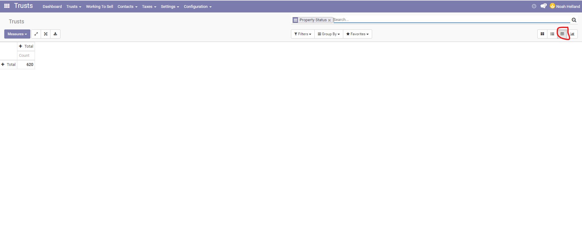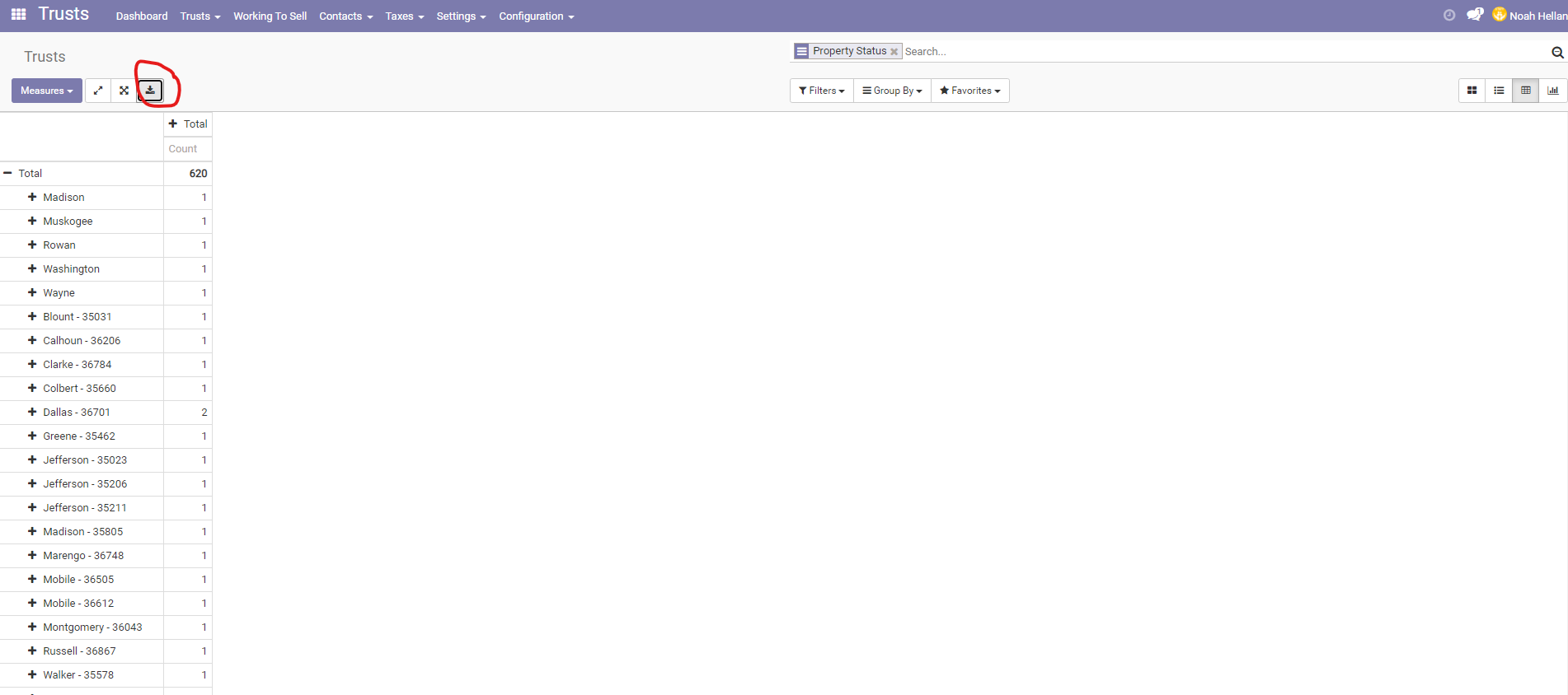 6. Next we want to find how many States, Counties, and Cities we have properties in. To do this we will be using the Matrix (Odoo), go on the trust page, and put it in pivot view.