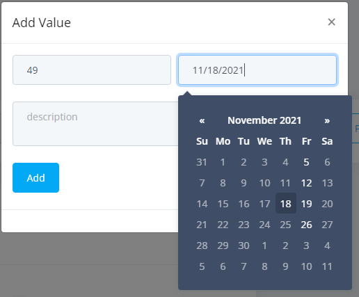 - Fill in the appropriate information in the pop-up window. The Description box can be used to enter any necessary details. When you have entered the Statistic for the approriate date, click "Add" to complete this entry.